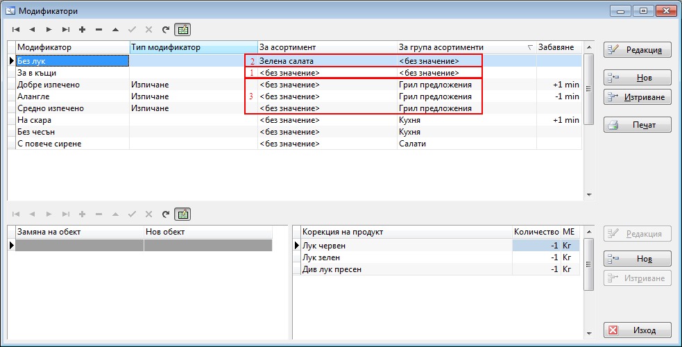 Пример: модификатор "Без лук" се настройстава да премахва всички продукти "лук" от рецептата