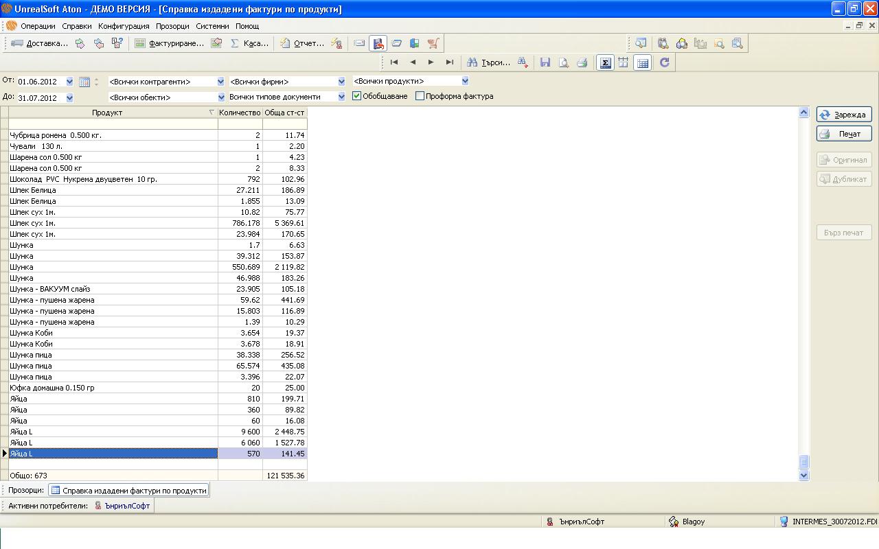 Става въпрос за склада за месо Интермес в Банско, там всеки месец и на половин година правят експорти, на издадените фактури, издадени фактури по продукти и справка продажби по продукти като ги пращат на счетоводството, проблема, е че когато се избере обобщаване в справка издадени фактури по продукти, остават по 4-5 реда от един и същи продукт не обобщени (преди обобщаването са доста по-вече, но това обобщаване не върши работа на клиента, отнема й много време за редакция на експорта в ексела, докато за справка продажби по продукти само отмята чекбокса обобщаване със средни цени и експорта е готов за пращане на счетоводството)
