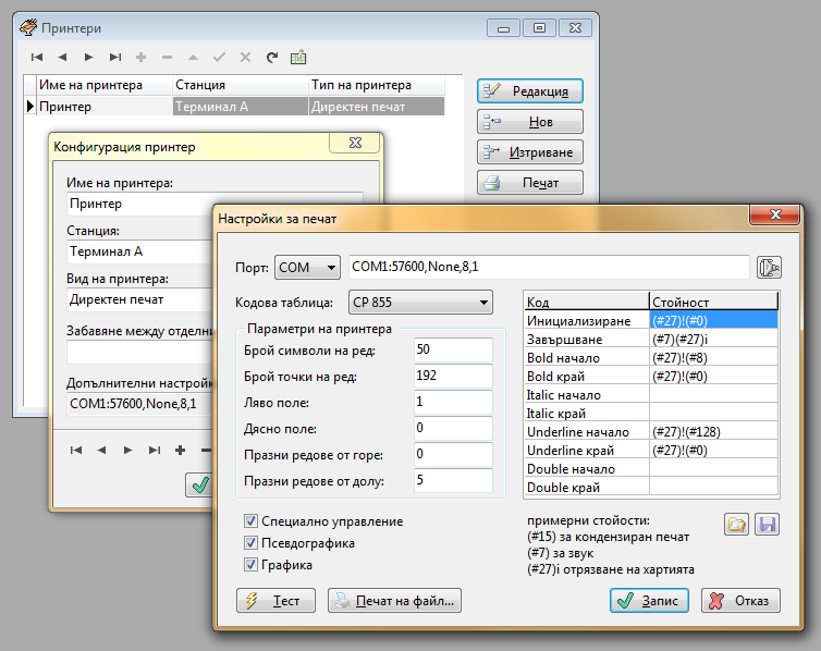 За първия Термонал А за печатите се избира Принтер А а за втория Терминал Б за печатите се избира Принтер Б. Настройките на принтера си остават такива както преди, но порта вече става PRN